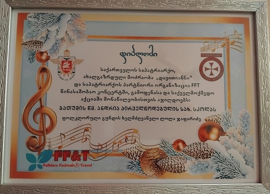 წინასაშობაო კონცენტრში მონაწილეობისთვის ფოლკლორული გუნდი დიპლომით დაჯილდოვდა.