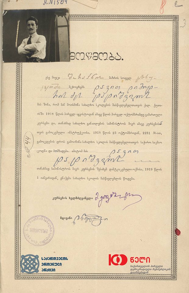 მოწმობის მიხედვით, დავით ტატიშვილმა სკოლის მასწავლებელთათვის 1918 წლის აგვისტოდან ოქტომბრამდე სახალხო განათლების სამინისტროს ქუთაისში ჩატარებული კურსები გაიარა და სახალხო მასწავლებლის სტატუსის მოსაპოვებელ გამოცდაში საკმაო ცოდნა და მომზადება გამოავლინა.