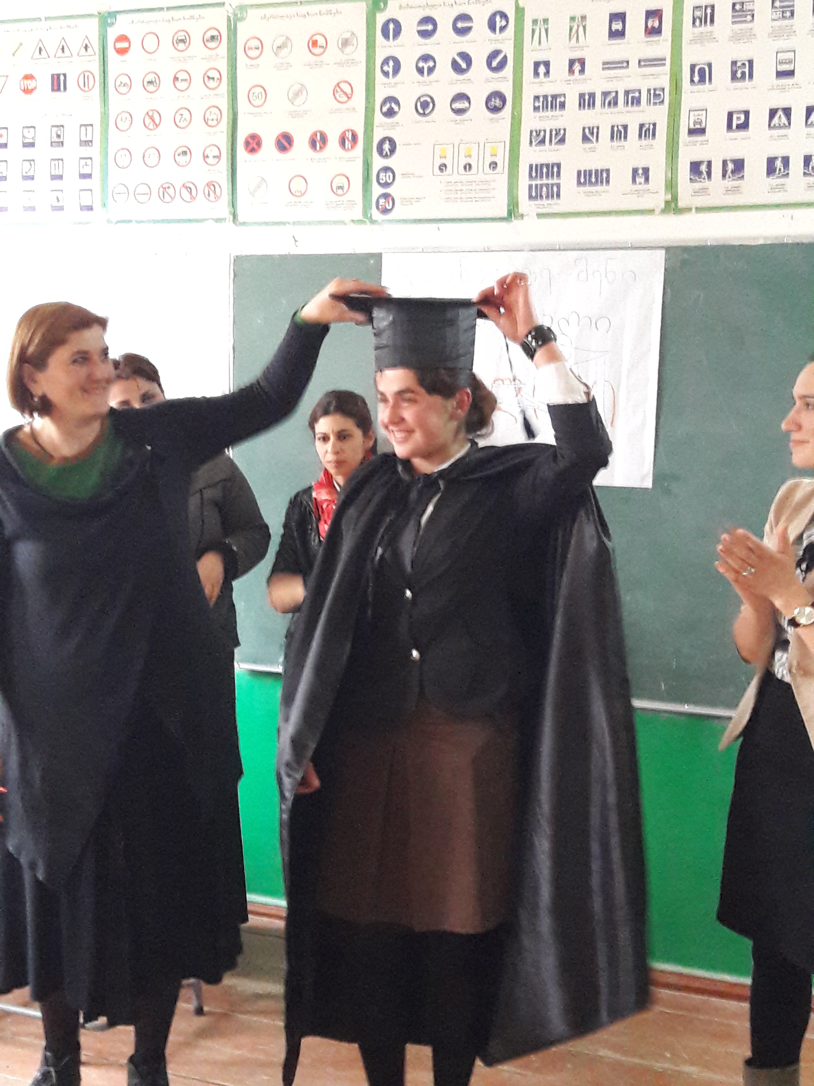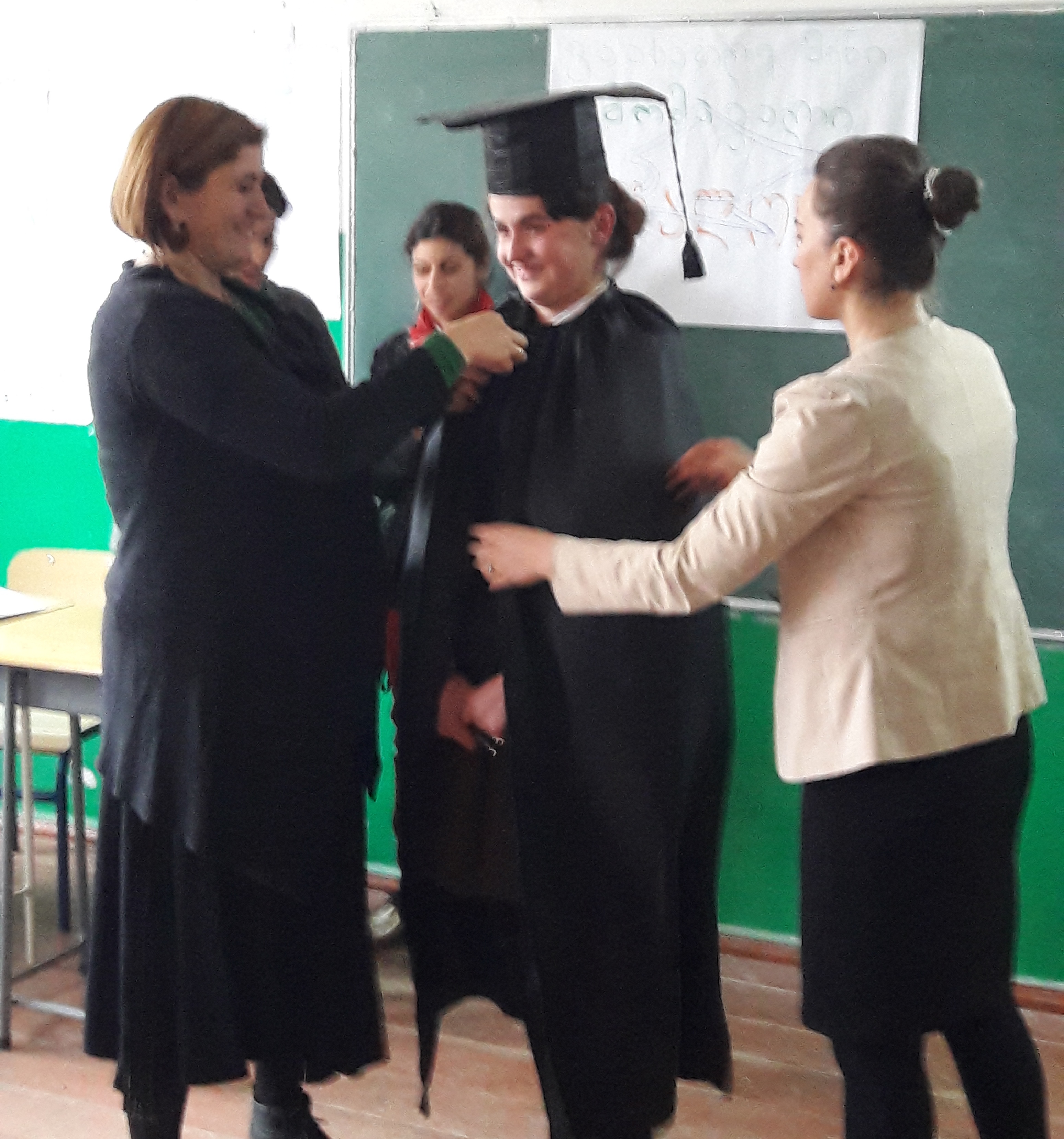 გამარჯვებული, მანტიით, სკოლის დირექტორმა ნათია რეხვიაშვილმა შემოსა.